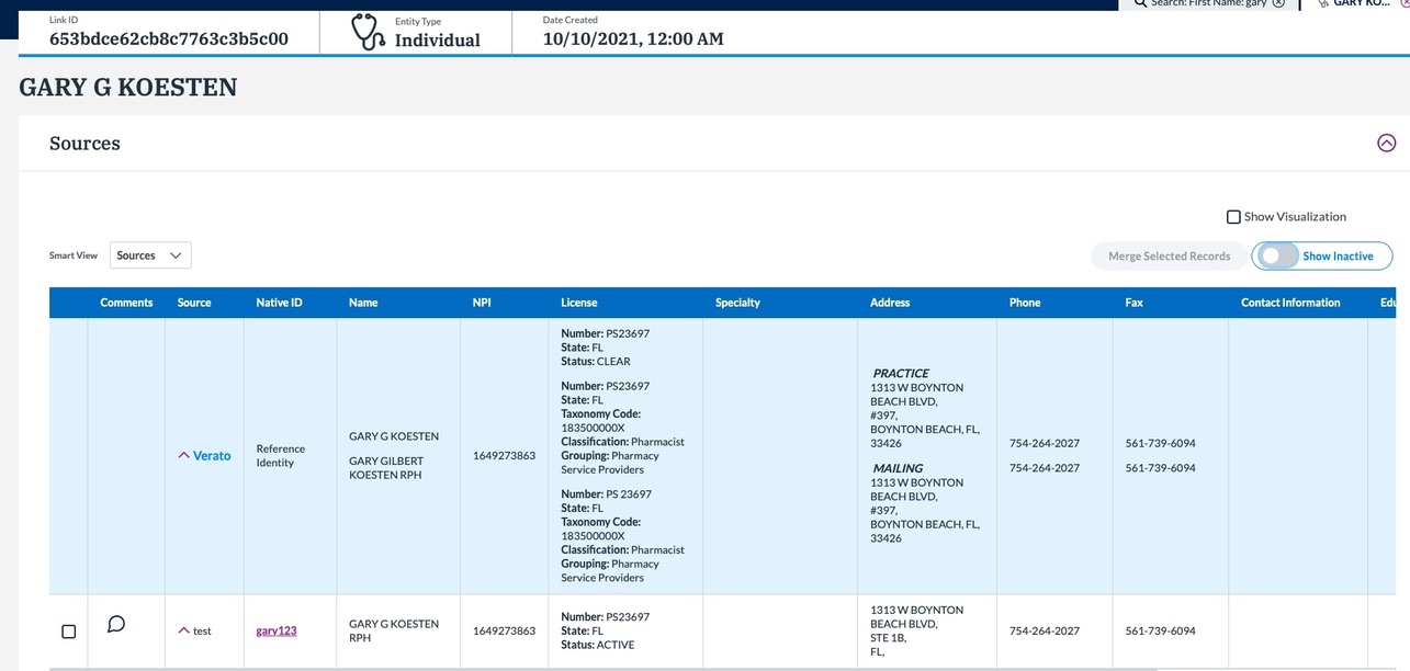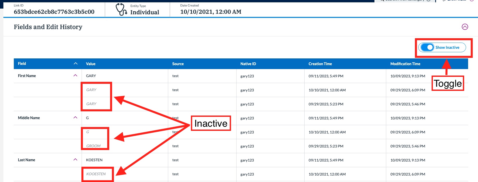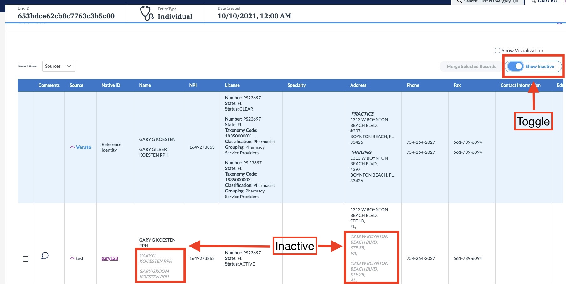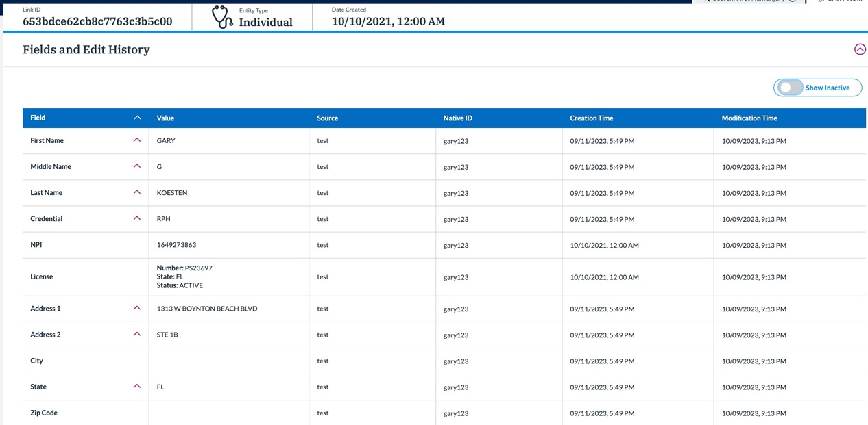 - For Provider, active data is displayed on tasks and identities. Seeing inactive data (data that is no long active, but still used for calculating the match score) can be done by clicking Show History in the task view or by activating the Show Inactive toggle on Smart Views and Fields and Edit History. Active data is in plain black font and inactive data is in italic light grey font.