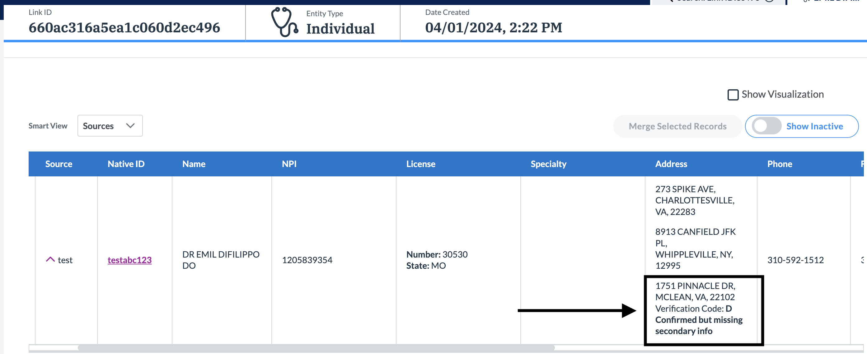 - Address verification information is also available in the source view and the Fields and Edit history section of an identity. The source view displays the verification code and description.